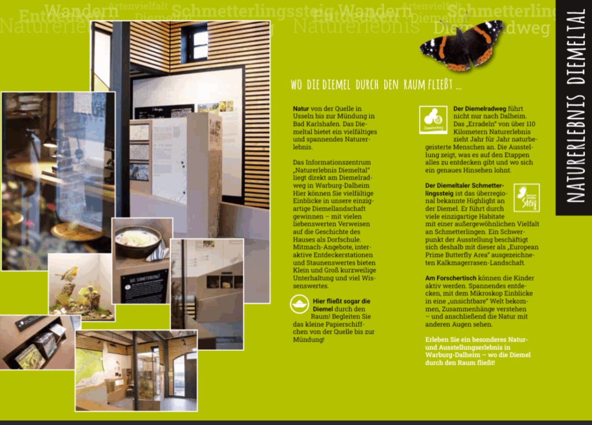 Die 45 qm große Ausstellungsfläche zur Umweltbildung dient als überregionaler Wegweiser und Informationsquelle für den 152km langen Rundwanderweg „Diemeltaler Schmetterlingssteig“ und den 110km langen Diemelradweg. Der Ausstellungsraum lässt durch eine Interaktive Erlebnis- und Umweltpädagogik die Themengebiete Diemeltaler Schmetterlingssteig, Diemelradweg, Kalkmagerrasen Landschaft Diemeltal und Diemelfluss Landschaft als großes ganzes ineinander verschmelzen.